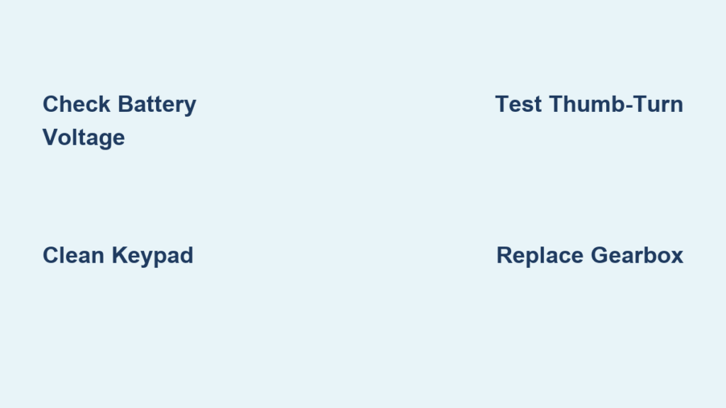 That ominous grinding noise means your deadbolt is fighting misalignment. Test this: Turn the interior thumb-turn manually. If it sticks or requires excessive force, your door frame has shifted—not the motor failed. Pro verification: Disconnect the motor JST connector and apply 6V directly from fresh batteries. If it spins freely, adjust your strike plate before gearbox replacement. Forcing the lock during testing strips nylon gears instantly. Yale’s data shows 63% of “motor failures” actually stem from door sagging over time.
